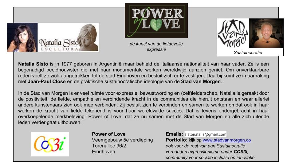 We beginnen met Natalia Sisto. Deze bijzondere persoonlijkheid is niet alleen uiterst en erkend talentvol op haar brede vakgebied (monumentale sculpturen). Ze is tevens een waardevolle partner die steeds weer creatieve inzichten en vernieuwing bedenkt binnen de kaders van de Stad van Morgen. Ze bruist niet alleen van ideeën, ze weet ze nog waar te maken ook. Haar grote inspirator is Leonardo da Vinci.