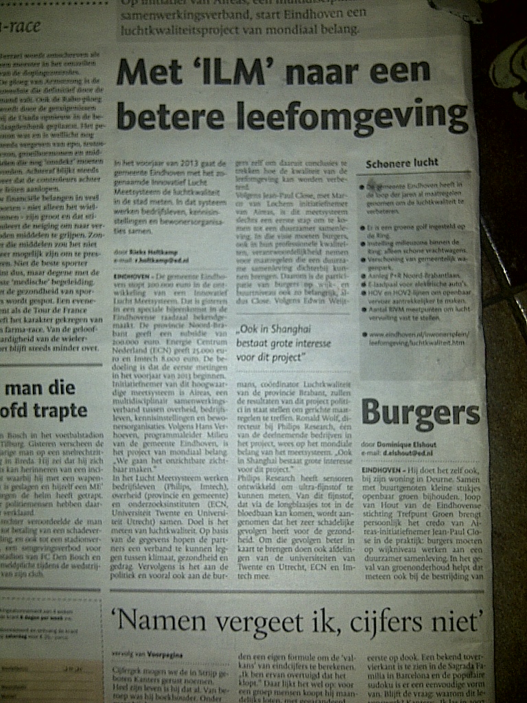 1. […] gezondheid in de stad Eindhoven door luchtkwaliteit als richtlijn te nemen. Iedereen deed mee. In oktober 2012 volgde de wereldwijde aankondiging van de samenwerking. Deze begon met het creëren van een speciaal meetnetwerk “het onzichtbare […]