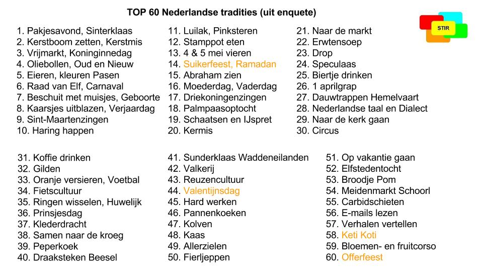 Op Internet vond ik een onderzoekje over de top 100 Nederlandse tradities. In dit plaatje toon ik de top 60.