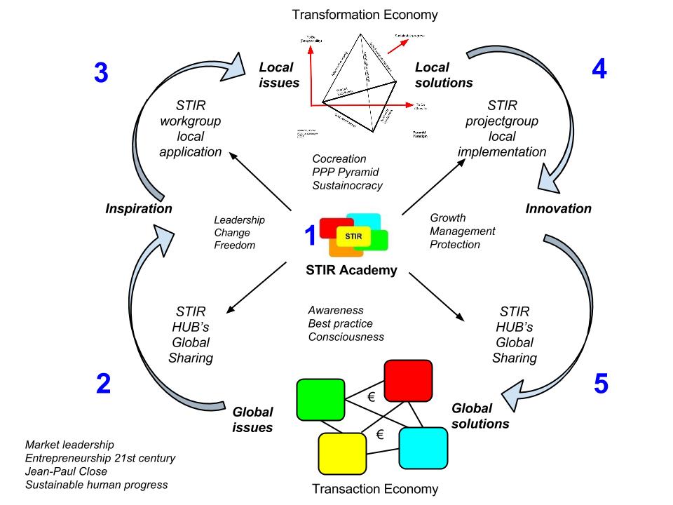 STIR Academy richt zich dan ook op de vermenigvuldiging van de kracht van verandering binnen de Sustainocratische werkwijze van waardecreatie en uitvergroting. Daarin zit ook een economisch component dat dankzij de ervaring opbouw in AiREAS van fundament en inhoud wordt voorzien. Het is logisch dat STIR Academy in het economische circuit een royalty uitkeert aan AiREAS waar de praktische kennis is ontstaan.