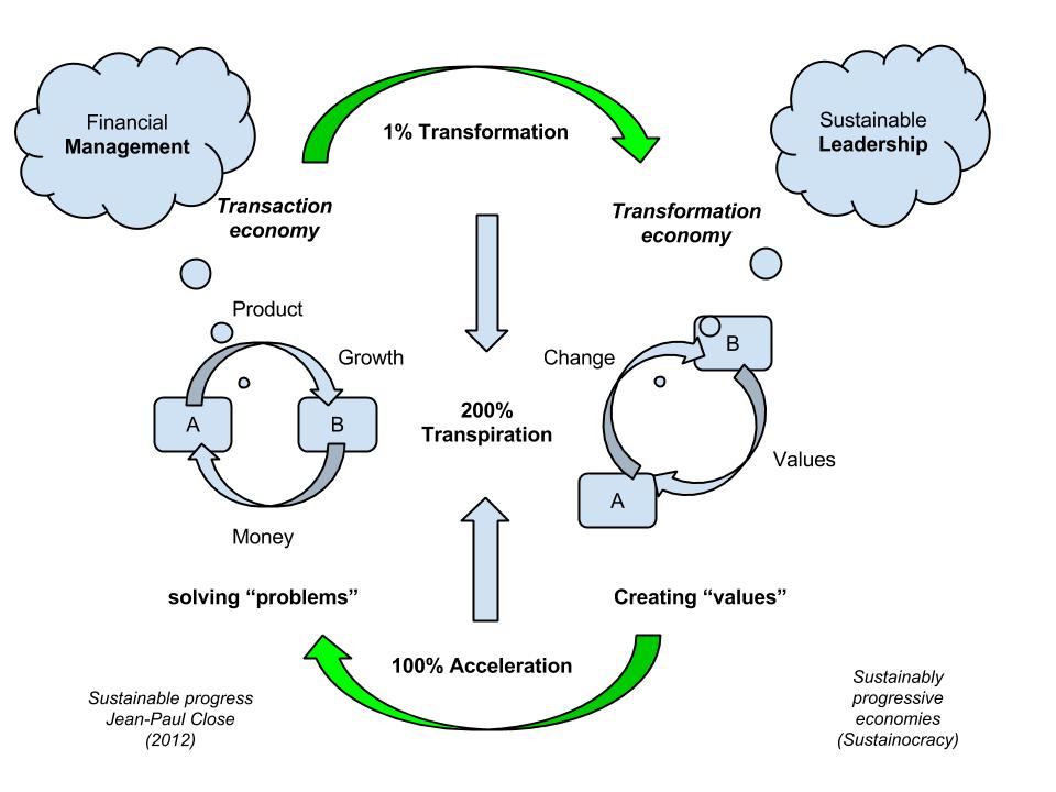 In een maatschappelijk initiatief zoals AiREAS, dat werkt aan een holistische benadering van gebiedsontwikkeling met de mens in optimale leefbaarheid relatie tot haar omgeving, is de tafelvoorzitter daarom altijd een Sustainocraat die het geheel overziet en de deelnemers helpt in het bewustwording en transitieproces waarin nieuwe groei-impulsen voortkomen door zelfbewuste investering in harmonie. Paradoxaal zal de waardecreatie die daarna in groei terecht komt op termijn ook weer leiden tot onbalans als de lijn van hebzucht de symbiose verstoort en het mechanisme van correctie in wordt gezet via leiderschap. Zelfbewustzijn door deelname zorgt voor eigen potentiële continuïteit door proactieve innovatie en zelfvernieuwing. Als men niet deelneemt laat men zich verrassen op termijn door de eindigheid van groei en de innovatiekrachten van anderen met chaos en faillissement tot gevolg.