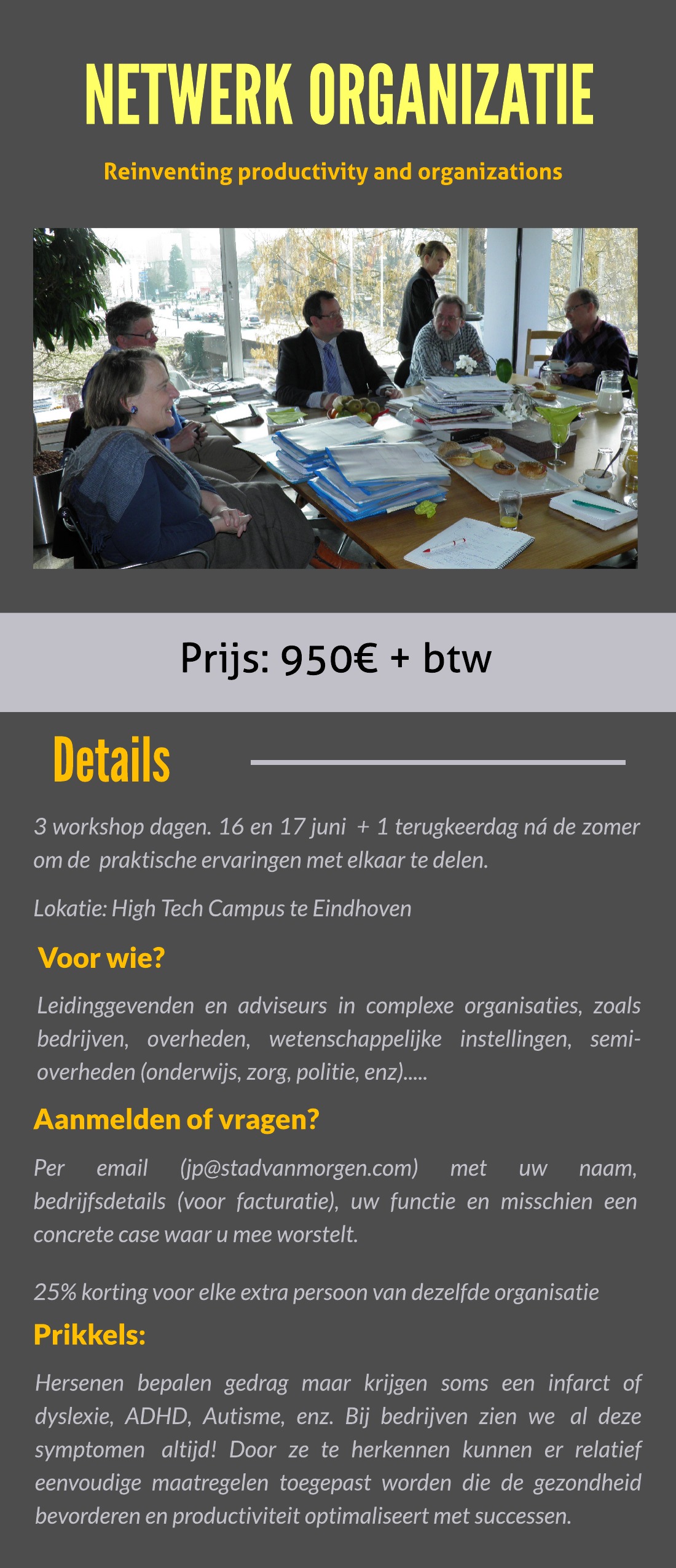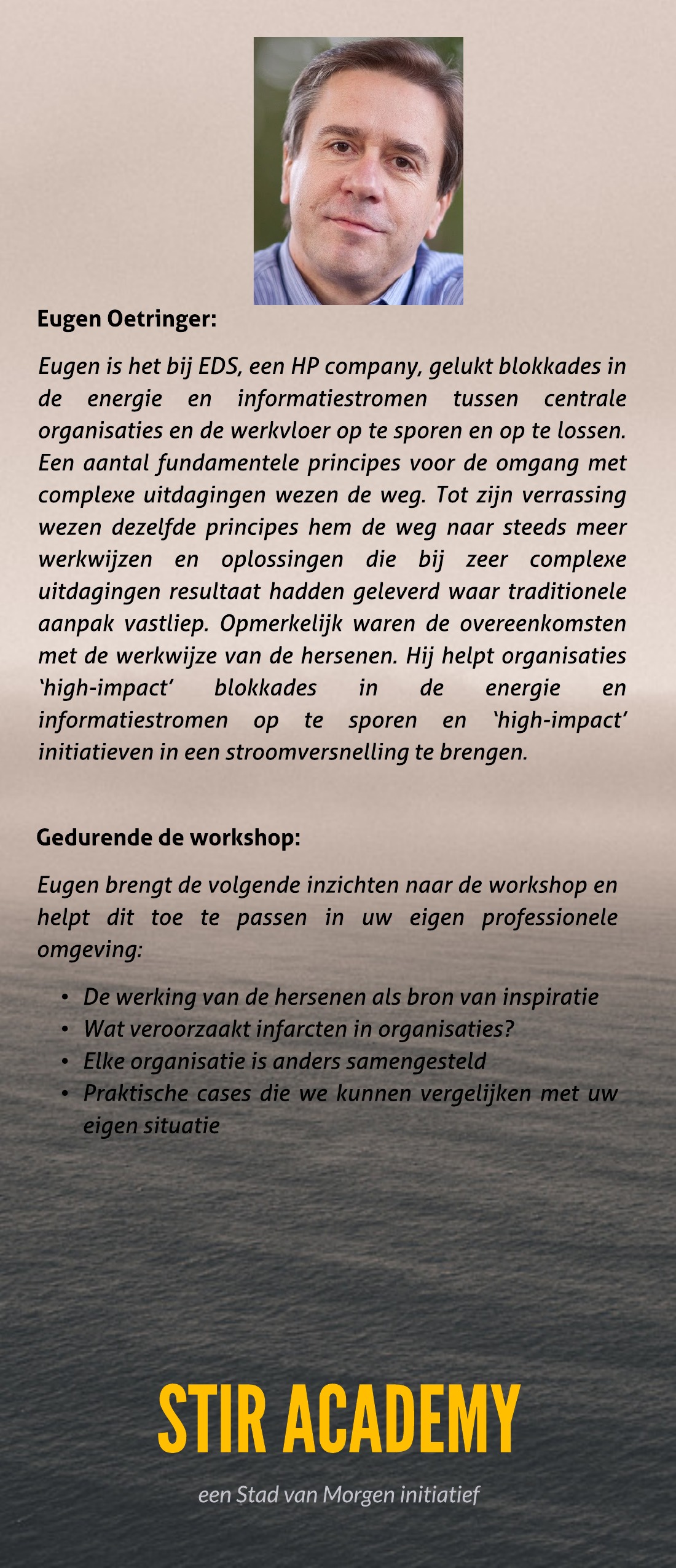Moderne inzichten over het functioneren van het brein en bijbehorende haperingen, storingen of infarcten vinden we ook in de organisaties met veel personeel, afdelingen die met elkaar moeten schakelen en de werkelijkheid zodanig moeten interpreteren dat de organisatie efficiënt, rendabel en productief zich ontwikkelt en reageert op constante veranderingen in de omgeving. STIR Academy is de organisatie binnen de Stad van Morgen die deze kennis uitvergroot wereldwijd door het aan te bieden in de sociaal economische context. De workshop van 16 en 17 juni, met terugkeer dag na de zomer is daar een voorbeeld van. Hier vindt u meer informatie: