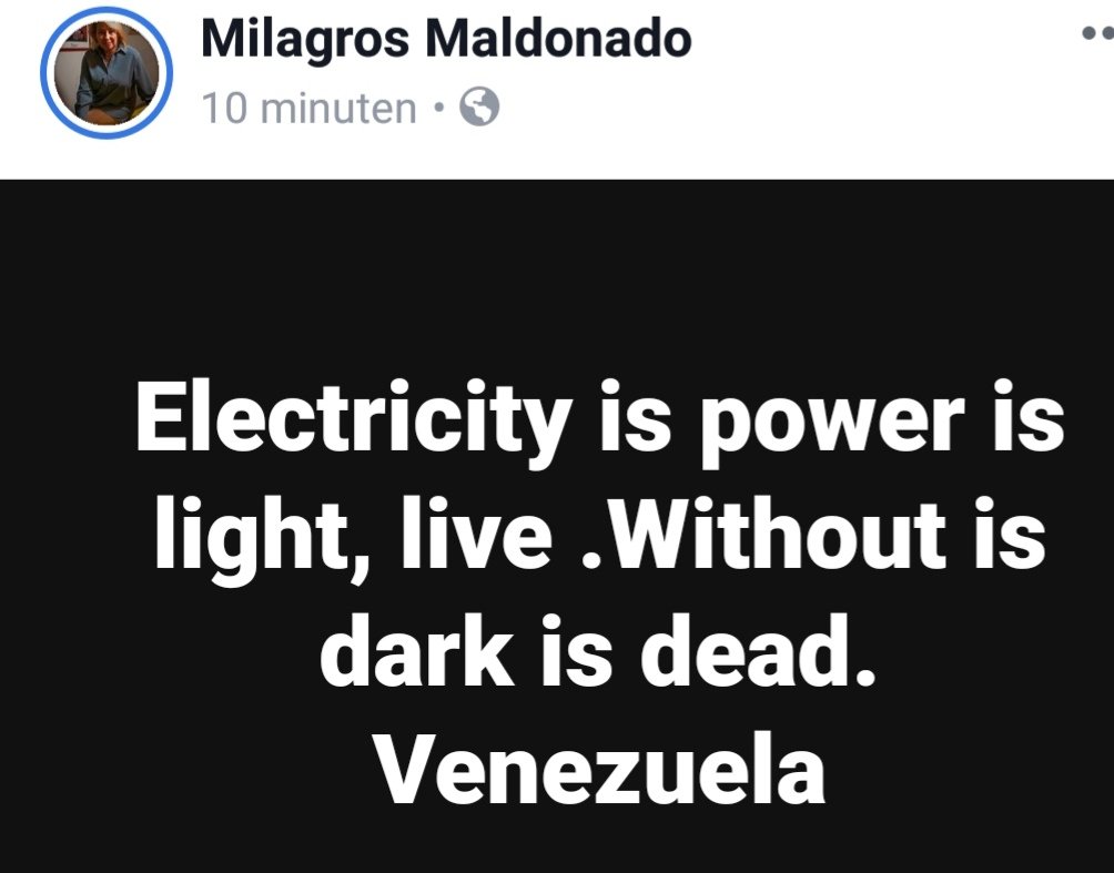De afgelopen tijd zit de hoofdstad Caracas zonder elektriciteit. In onze sustainocratische visie is energie een van de kernwaarden waar we samen verantwoordelijkheid voor dienen de nemen. Als we dat niet doen dan kan een willekeurige idioot de stekker eruit trekken. Dan verrot ons eten, doen de ziekenhuizen het niet meer, kunnen we niet meer communiceren met de massa of onderling, enz. Machthebbers verwijten anderen om haat te zaaien maar hanteren hun eigen verborgen agenda’s met hun handlangers.