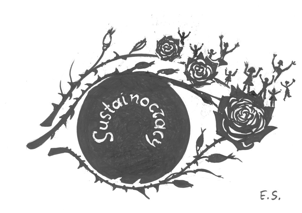 Het oog is voor mij de deur naar onze ziel. Via de vele gelaagde obstakels, zoals opgelegde dogma’s, levenslessen en gebeurtenissen, komen we bij de bron, daar waar Sustainocratie is geboren. De doornen transformeren zo in mooie rozen en vrolijke mensen, jong en oud. Bijzonder hoe Evi dit alles geeft kunnen vastleggen in een prachtig beeld. Hartverwarmend!