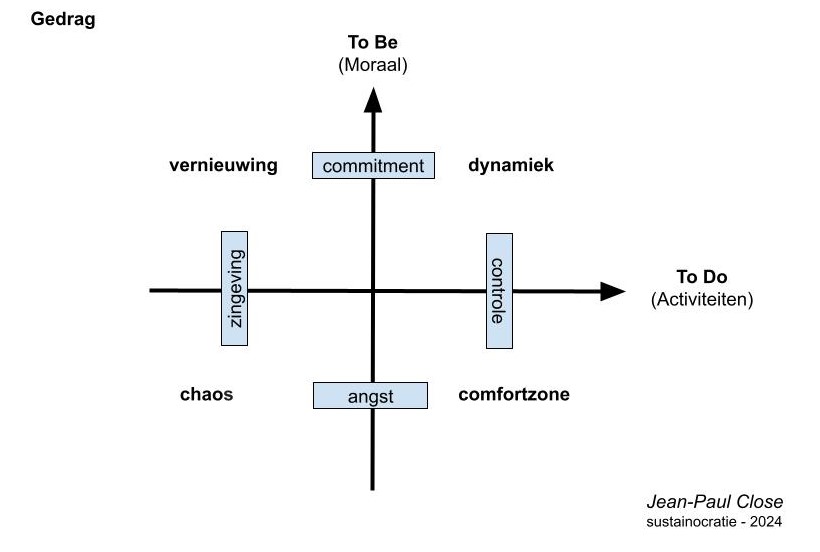 Ideaal zou zijn als we als maatschappij permanent ons zouden positioneren in de natuurlijke ruimte van “leven”, zodat verandering een onderdeel wordt van ons dagelijkse bestaan, waar we vol vertrouwen mee omgaan. In plaats van ons permanent te plaatsen in “overleven” met angst als drijfveer om ons vast te houden aan belangen, tegen beter weten in. Het leven is zoveel dynamischer, levendig, leuker en veiliger als we ons open blijven stellen aan duurzaam gerichte vernieuwing, niet alleen groei.