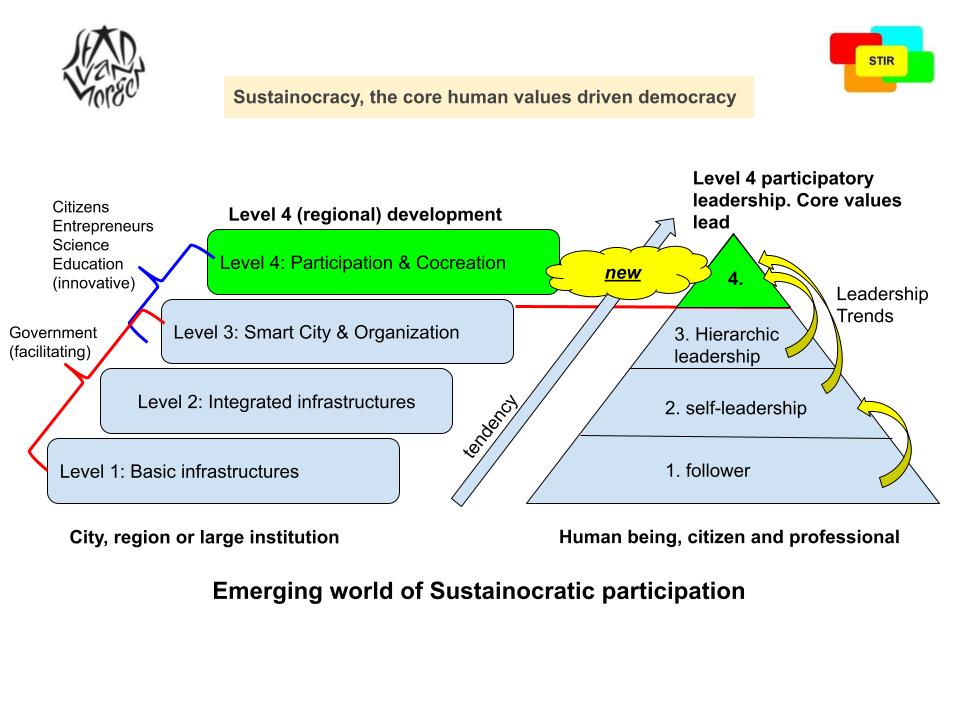 Om die gezamenlijke verantwoordelijkheid te dragen hebben we een nieuwe laag toegevoegd aan onze maatschappij: De participatie laag, niveau 4. Hierin participeren zowel de overheid als de inwoners, de kennisinstellingen, het onderwijs en het bedrijfsleven in die gemeenschappelijk verantwoordelijkheid voor het herstellen en handhaven van onze essentiële waarden. Stad van Morgen organiseert en verbindt op niveau 4. Stad van Morgen is een stichting (Stichting STIR) en houdt zich bezig met alles wat je maar kunt bedenken in een samenleving en altijd vanuit die gemeenschappelijke waarden.