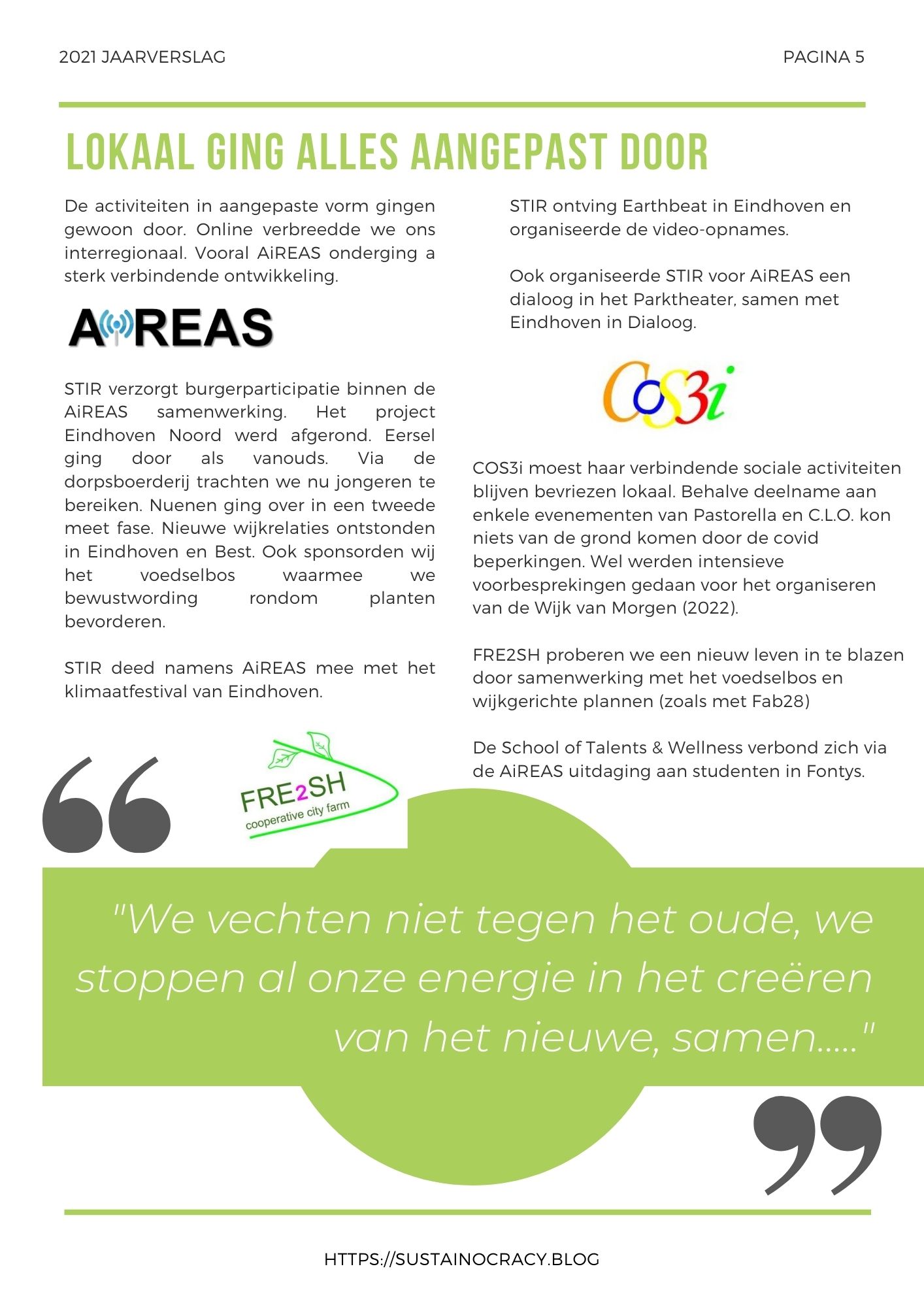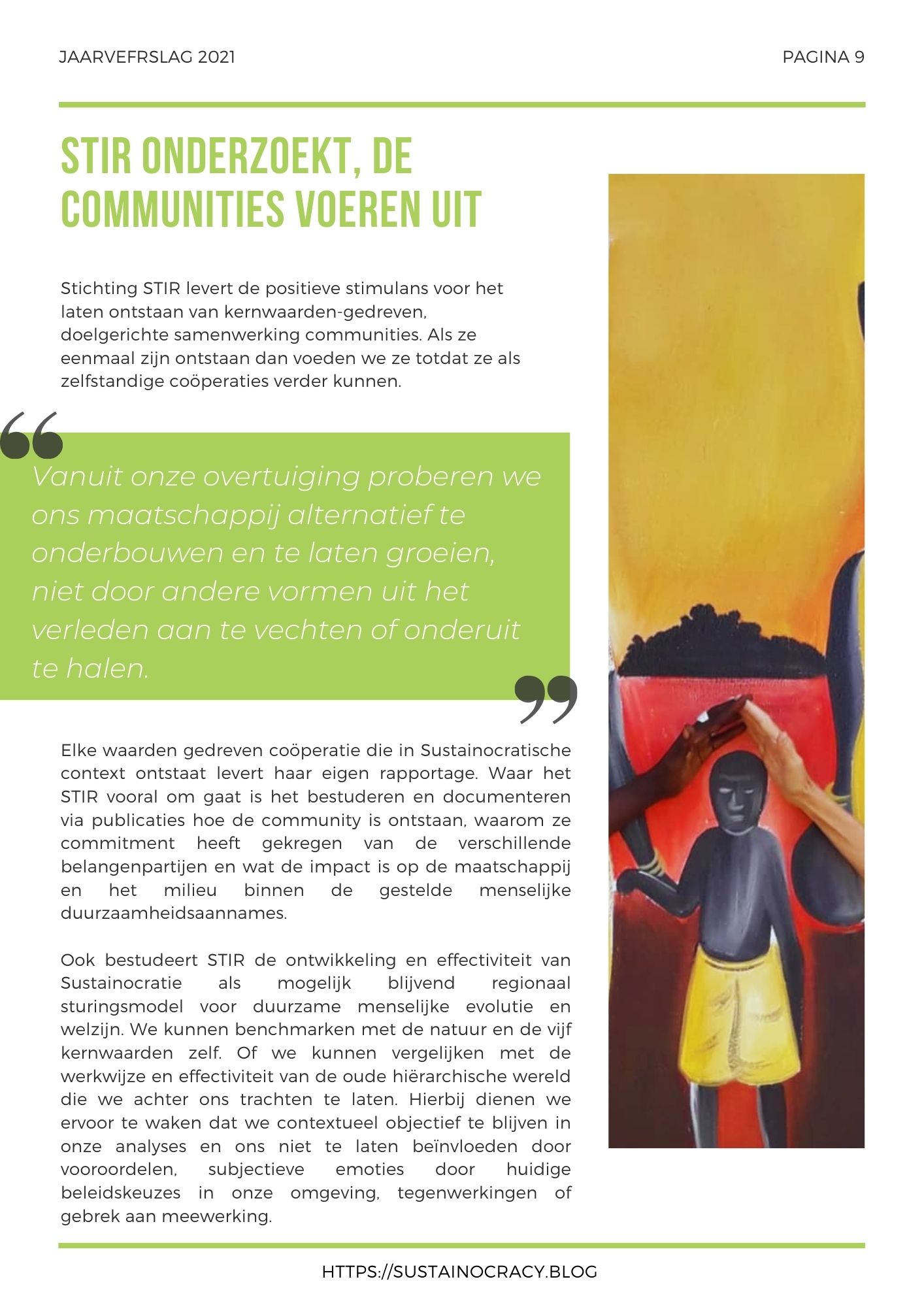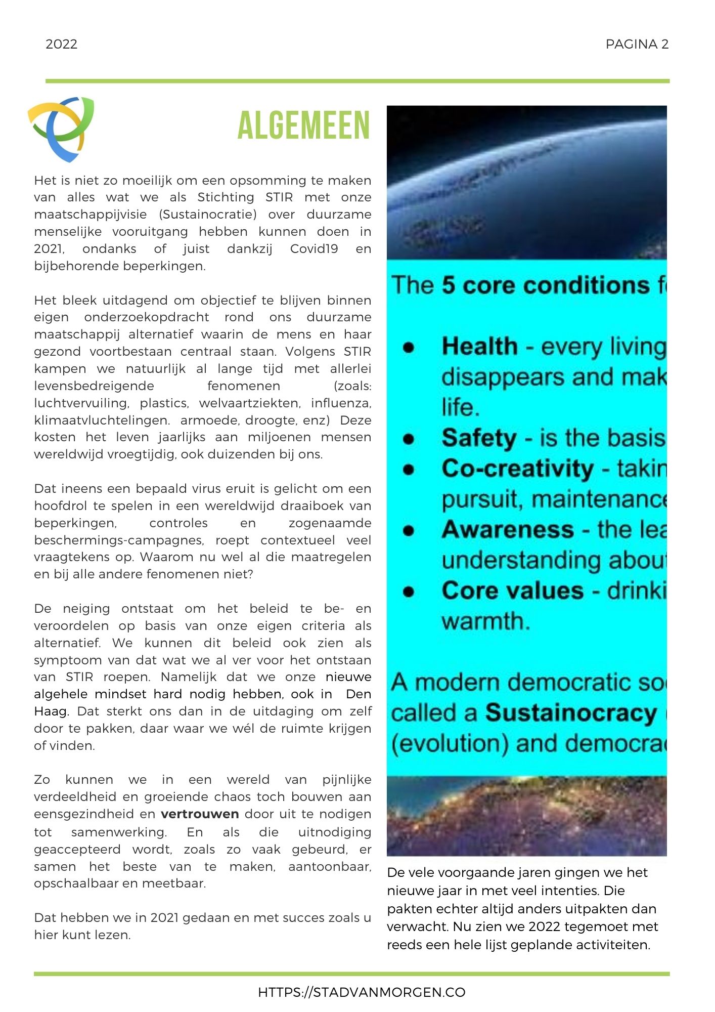 In een wereld vol tegenstrijdige belangen willen wij toch proberen ergens in Nederland de handen op elkaar te krijgen voor de “cocreatie van de Wijk van Morgen”. Het zou een proefgebied moeten worden voor de hele wereld. In de Wijk van Morgen gaan we de moeilijkste uitdagingen aan, samen met de inwoners, de overheid, zorginstellingen, woningbouwcorporaties, verzekeringen, kennisinstellingen en bedrijven. We pakken het Sustainocratisch aan.