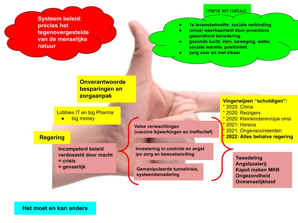 Een vingerwijzende regering toont haar incompetentie op gebied van menselijkheid. Alle maatregelen die ze neemt rondom een vermeende pandemie worden bedacht vanuit systeemdenken. Maar zo werkt de natuur niet, ook de natuur van de mens niet. Voor dit soort situaties is een hele andere vorm van regering nodig, niet reactief, niet systemisch (geld en macht) maar proactief, holistisch (mens en natuur).