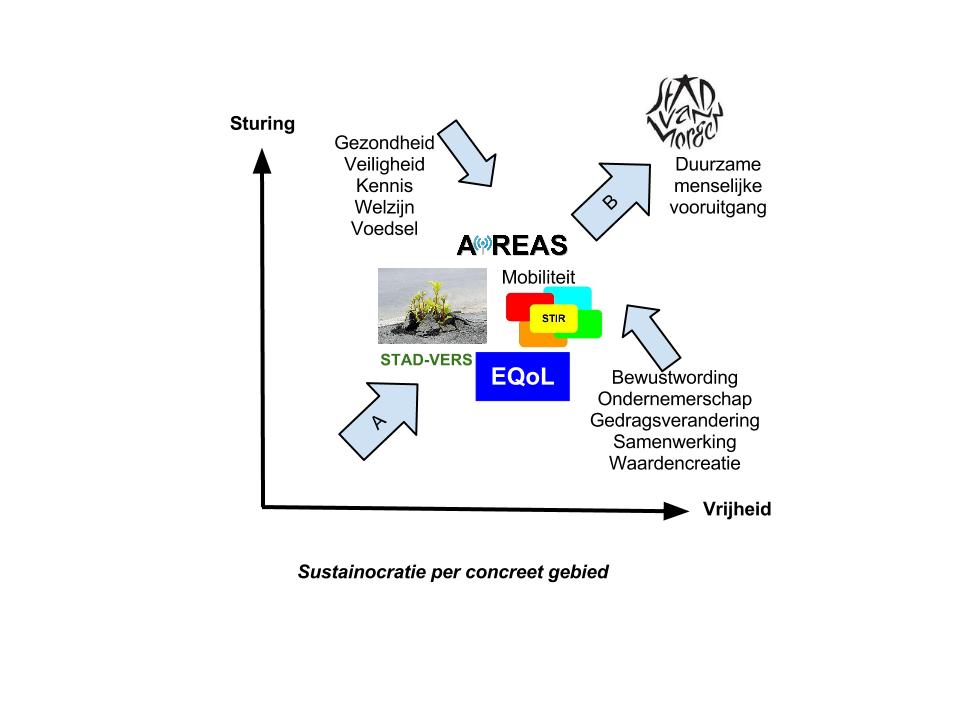 Boeiend is dat de institutionele belangen ook mee doen met het Sustainocratische centrum. Door een onderscheid te maken tussen niet geld maar zingedreven creatie, co-creatie en verhandeling in de complexiteit van de moderne maatschappij ontstaat er een geheel nieuwe maatschappelijke dynamiek. Sustainocratie is als een publieke R&D met de betrokkenheid van de gehele lokale bevolking en instanties. Het volgt het pad van de natuurlijke processen (zie hieronder) van evolutionaire vernieuwing (Stad van Morgen), co-creatie van vernieuwing (zoals AiREAS) en groei (zoals de huidige maatschappij).