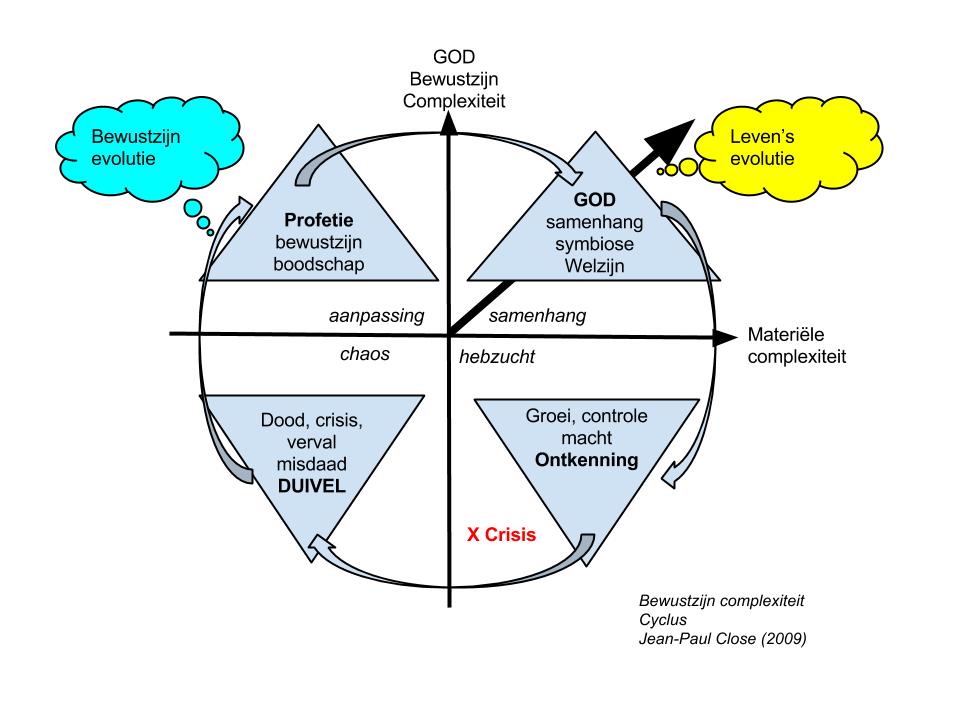 In de complexe vorm van de mens, waarin 5 miljard jaar Aardse levensevolutie tot leven komt en zich herhaalt, ervaren wij dit moleculaire bewustzijn als spirituele openbaring terwijl onze dagelijkse mechanismen functioneren middels de interactie met zintuigen en emoties. Deze trachten wij te rationeel interpreteren vanuit het fenomeen zelf-bewustzijn. De communicatieprikkels veroorzaken een complex samenspel van innerlijke chemische en levenskracht processen (zoals hormonen) die bepalend zijn voor de manier waarop wij reageren op prikkels vanuit o.a. opgewekte emoties. Het rationaliseren van de vele prikkels is een soort filter om de vele innerlijke impulsen te nuanceren en structureren. Veel van onze keuzes gebeuren nog automatisch en onbewust door de natuurlijke processen van actie = reactie in onze chemische huishouding, maar sommige keuzes zijn doorgebroken tot ons bewustzijn en worden beïnvloed door ons niveau van rationele interpretatie van prikkels. Angst bijvoorbeeld staat aan de basis van ons bewustzijn rond goed en kwaad waaruit de krachten van de duivel die van God lijken te evenaren maar uiteindelijk God altijd wint. God is het eeuwig leven en de harmonie, de duivel is de angst voor pijn en de dood. Tussen God en de duivel zit de fase van Godsontkenning van harmonie door de agressie van groei en hebzucht of gemakzucht. Tussen de duivel en God zit de profetie van een harmonieus leven door samenhang vanuit bewustwording. In de werkelijkheid staat God synoniem voor welzijn en de Duivel voor chaos. Als we het goed hebben dan ervaren we harmonie en is ons God-besef ver te zoeken. Als we het slecht hebben dan gaan we op zoek naar nieuwe harmonie via profeten en vervloeken het slechte (de duivel). Wij beleven de innerlijke krachten tussen God en de duivel door cyclisch ons te bewegen in de transitie van welzijn, via luiheid en hebzucht naar chaos en vernieuwing naar nieuw welzijn door bewustwording na pijn.