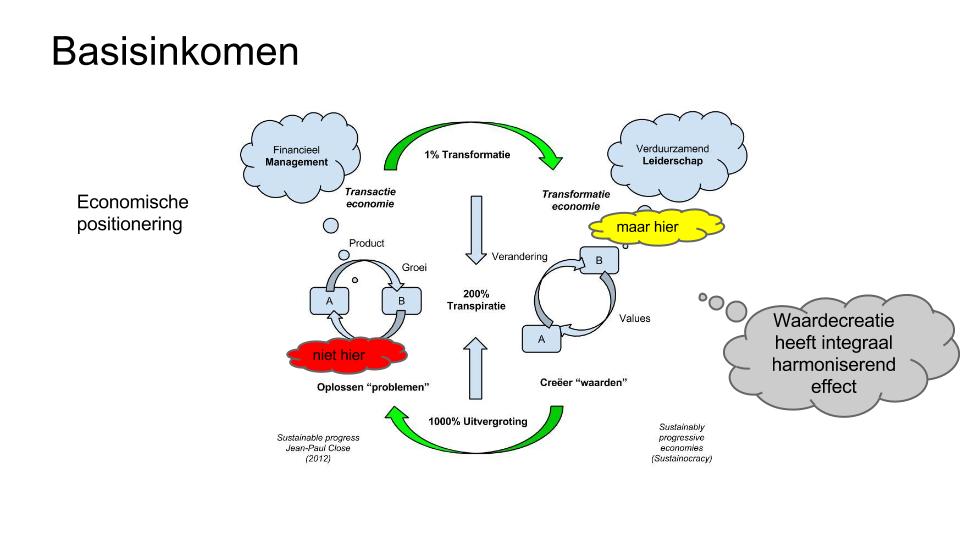 In Sustainocratie zetten we de overheid naast de andere partijen, met dezelfde essentiële verantwoordelijkheden vanuit een infrastructuur en diensten perspectief. Niet groei noch financiële afhankelijkheid maar balans en cocreatie. Geen keten van afhankelijkheden maar een community van samenredzaamheid. Die positie moet eerst als optie erkend worden, dan worden aanvaard en daarna de maatschappelijke onderlinge relaties erop worden afgestemd.