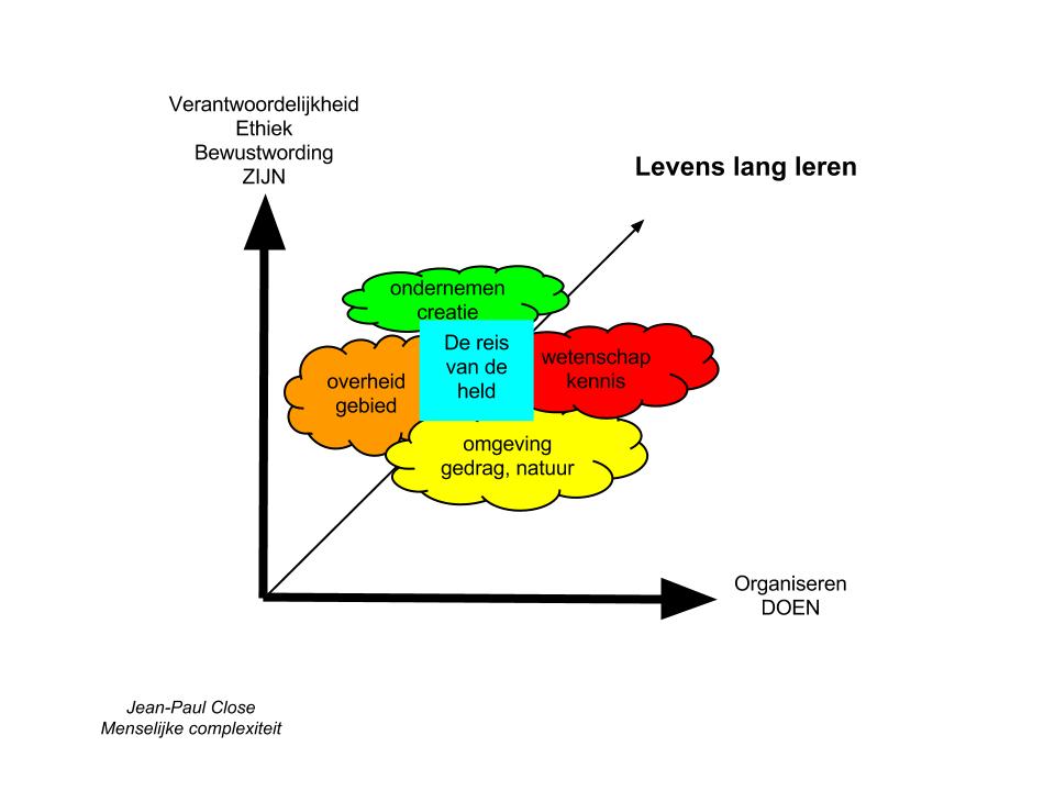 Het gaat niet om een vingertje opsteken en klagen. Het gaat om het verbinden van de mens en het leersysteem met de menselijke werkelijkheid in de opvoeding, opleiding en begeleiding van onze jeugd. Elke mens is “een held” en leert het hele leven om te gaan met de zoektocht naar het geheim van duurzame welzijn en vooruitgang. Dit gebeurt door geprikkelde interactie met de omgeving en reflectie over de eigen resultaten. We moeten als mens weer het menszijn gaan waarborgen in onze omgeving en systemen, te beginnen met het onderwijs!