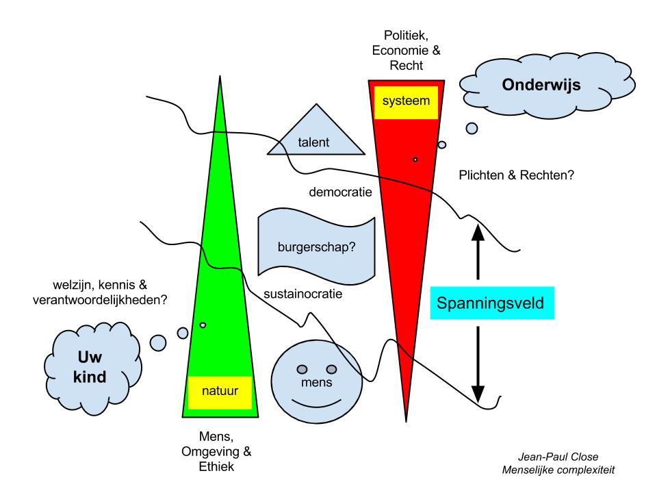 De maatschappelijke focus op consumptie economie die belast wordt om de kosten van een zorgstaat te financieren heeft volgens Jean-Paul Close geleid tot een integrale breuk met de natuurlijke processen waarvoor een sturing is geïntroduceerd die niet de menselijke belangen dient maar die van een economisch in stand te houden systeem. De evolutie krijgt dan geen kans omdat verandering tot de taboe sfeer gaat behoren. Het onderwijs wordt door de financiële afhankelijkheid gestuurd waarin ouders en kind niet als mens maar als economische drijvers en kostenposten worden beschouwd, omringt door instanties die er belang aan hechten om een gefragmenteerd deel van een bestaan ter harte te nemen zodat steeds passend wordt gemaakt in het systeembelang.