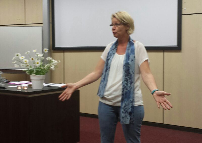 Riet wist ons meteen te verrassen met de vraag om eens goed rond te kijken naar alles wat blauw is. Daarna vroeg ze ons om de rode dingen op te noemen. We hadden natuurlijk niets roods gezien ook al waren die er wel. “Wat benadrukt wordt krijgt aandacht en groeit. Dat geldt voor alles, ook de positieve en negatieve dingen,” aldus Riet. Zo zette zij de toon van haar college over “weerbarstige” pubers. Haar college was doorspekt met verhaaltjes en voorbeelden uit haar docentschap. “Contact”, zegt ze, is de basis van alles. Zonder contact kom je met de pubers nergens. Daarnaast wil elk mens volgens Riet drie basis dingen: