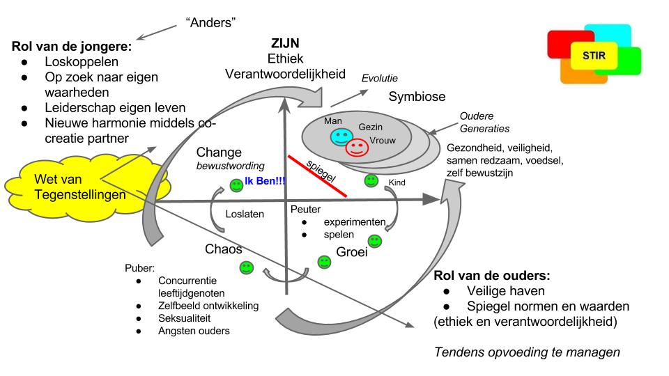 De intuïtieve, praktische aanpak van Riet, die zij zelf met jarenlange ervaringsopbouw tot een bruikbaar model heeft gerationaliseerd voor deelbaarheid met anderen, werd vervolgens door Jean-Paul in context geplaatst van de evolutionaire ontwikkeling van de mens en onze maatschappelijke systemen. In de miljarden jaren van evolutie beleven wij individueel steeds weer sinds de conceptie als kind via de harmonieuze band van de ouders via de groeifasen van het evolutionaire bewustzijn: