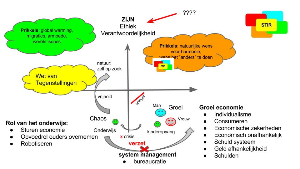 Op 17 december voltrok zich het proefcollege van de STIR Academy over het onderwijs. Gastdocente was Jacqueline de Theije, initiatiefneemster van de Eindhovense DOE School. Dit is een school die de mens centraal stelt en de kinderen uitdaagt vanuit hun zelflerende vermogen. Dit initiatief is een van de vele intenties tot vernieuwing van een onderwijssysteem dat uit de tijd is, ontstaan in een tijdperk van industriële arbeid, standardisatie van processen en hiërarchische structuren, uniformisering van economische belangen en bijbehorende robotisering van de mens. Maar die tijd bestaat niet meer, ook al wordt er nog steeds politieke en economische macht aan ontleend. Het is die machtuiting die de vernieuwing in de weg heeft gestaan maar dankzij de vele crisissen en het uitblijven van herstel van het verleden, ondanks de belastingverhogingen en kapitaalinjecties, is de noodzaak tot het openstellen van de vernieuwing nu ook doorgedrongen tot de hogere beleidsferen van de landelijke overheid.