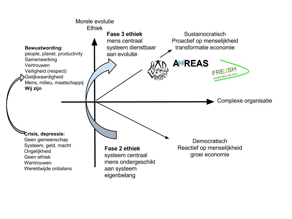 De kern van de transitie is het maatschappelijke bindmiddel van samenhorigheid, het gevoel dat we samen de maatschappij creëren door waarden te scheppen die voor onszelf belangrijk zijn. Dit “wij zijn” waardegevoel bestaat niet in een economie. Het hogere Sustainocratische doel geeft hart en bezieling aan een samenleving die zich uit in samenwerkingsprocessen. Het borgen van het vertrouwen en het streven naar harmonie dient de grondwettelijke basis te zijn waar we samen voor waken door onze uitdagingen te plaatsen in context van bewustzijn en verandering in plaats van groeiende geldafhankelijkheid. Het rechtssysteem dient dan het despotengedrag te veroordelen in plaats van te steunen zodra het waarde onttrekt aan de maatschappelijke harmonie. Dat is dan tevens een signaal voor veranderaars om vernieuwing en innovatie door te voeren die niet een economische doelstelling hanteren maar zich funderen op mens en milieu gedreven herstel van harmonie. Dit verlangt een andere dynamiek dan we gewend zijn hetgeen wij in kleine schaal van AiREAS reeds met vele 1000den mensen uitoefenen. Er komt gaandeweg een moment dat het zich regionaal en landelijk borgt doordat oude machtsculturen hun bestaansrecht verliezen terwijl de waardengedreven structuren resultaten boeken die juist het bestaansrecht bevestigen en de transitie van het rechtssysteem mede mogelijk maken.