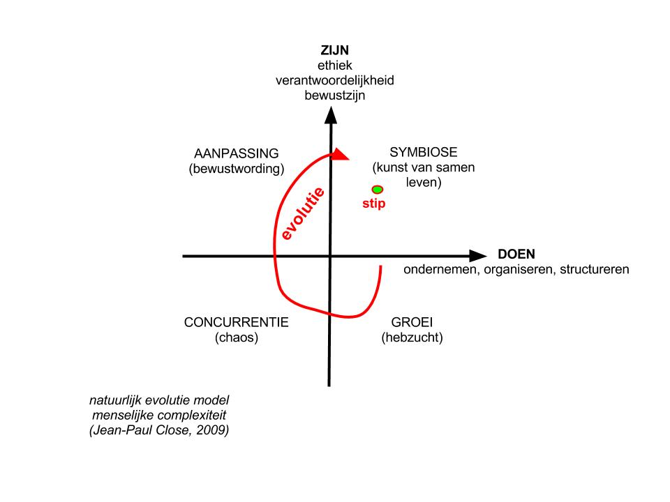 Nu, 10 jaar later, denk ik daar anders over, mede dankzij de enorme ervaring die ik sindsdien heb opgebouwd door met de menselijke complexiteit te experimenteren. De cyclus is een te beperkte benadering en heeft betrekking op een enkele persoon, een enkel organisme, een enkel samenlevingsmodel (gebaseerd op gebrek aan zelfbewustzijn), een natuurlijk verloop tussen leven, groei, dood en vernieuwing. Het moderne zelfbewustzijn is in staat de evolutionaire cyclus op een bepaald moment te doorbreken en naar eigen hand te zetten. Harmonie wordt dan geen doel maar een keuze. In plaats van ons de cyclus te laten overkomen (eerst doen, consequenties aanvaarden en dan leren zijn door reflectie) leren wij omgaan met de hele cyclus vanuit een nieuw perspectief en context dat de eenzijdigheid van de mens overstijgt . Nu doen we dat nog maatschappelijk vanuit het perspectief “groei economie” waarin we ons allemaal afhankelijk hebben gemaakt van het concept “geld” hetgeen ons een vertekend beeld heeft gegeven van de werkelijkheid en onze situatie daarin. Als we het perspectief “harmonie”, of liever gezegd “samenhang” of “symbiose” (een woord waarin wederkerigheid een plek krijgt), kiezen dan verandert onze perceptie van onze wereld en ook ons gedrag en de keuzes die we maken, inclusief eventueel onze relatie met middelen, zoals geld, technologie en kennis maar ook “de natuur”, grondstoffen en menselijke relaties. Waar het in de context van “geld” gaat om zelfbewust overleven, draait het in de context van “symbiose” om zelfbewust leven.