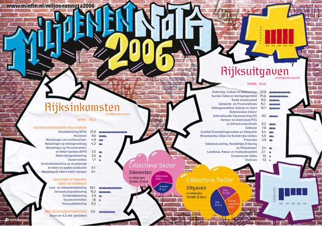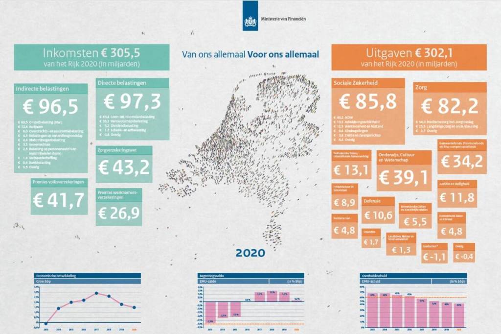 Als we plaatjes naast elkaar leggen zien we dat de overheid haar presentatie heeft aangepast. Waar voorheen (2006) de belasting over twee grote delen werd weergegeven, met apart een bijdrage van gastbaten, zijn het er nu drie. Dat komt door de privatisering van o.a. de zorg via verzekeringen. De drie hoofdlijnen zijn nu: directe belastingen, indirecte belasting en verzekeringen (zorg, volks en werk), elk goed voor ongeveer een derde van de inkomsten. In 2020 gaat het om ruim 300 Miljard Euro, zowel aan de kant van de inkomsten als de uitgaven.